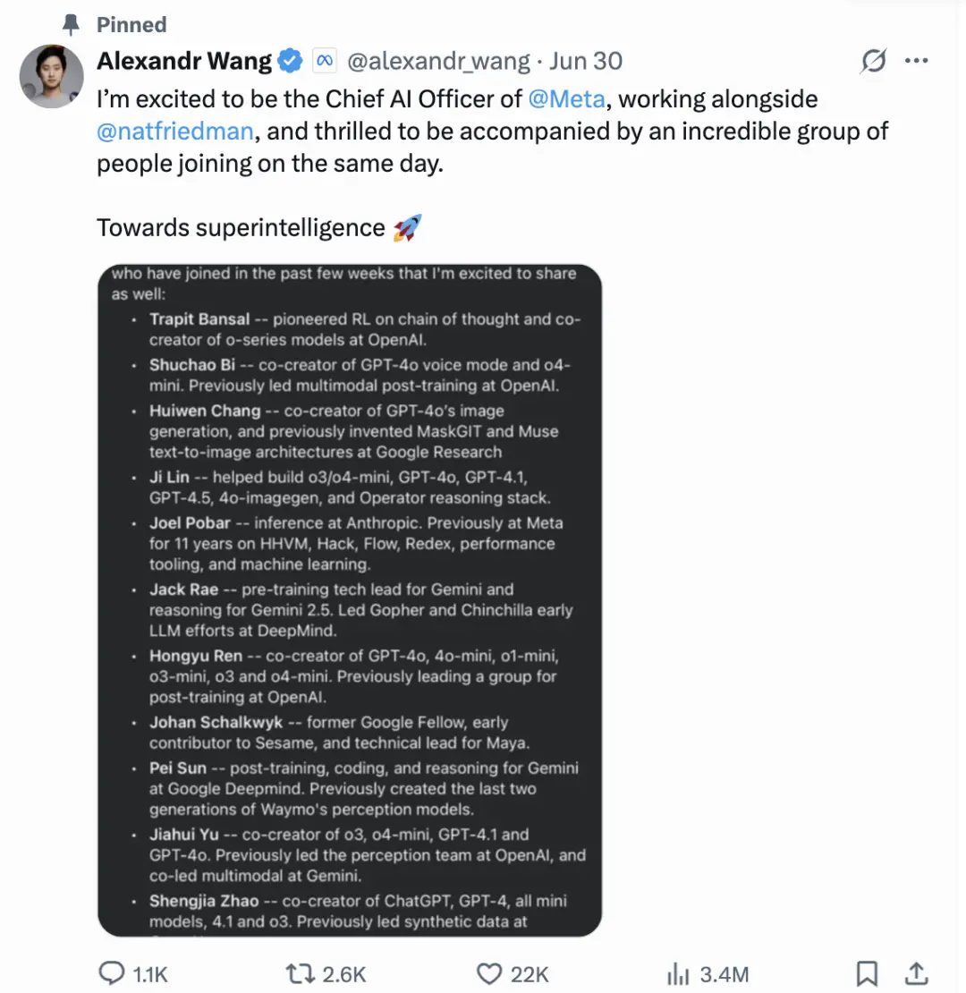 Alexandr Wang 公布的 Meta 超級智能實驗室人才|圖片來源:X